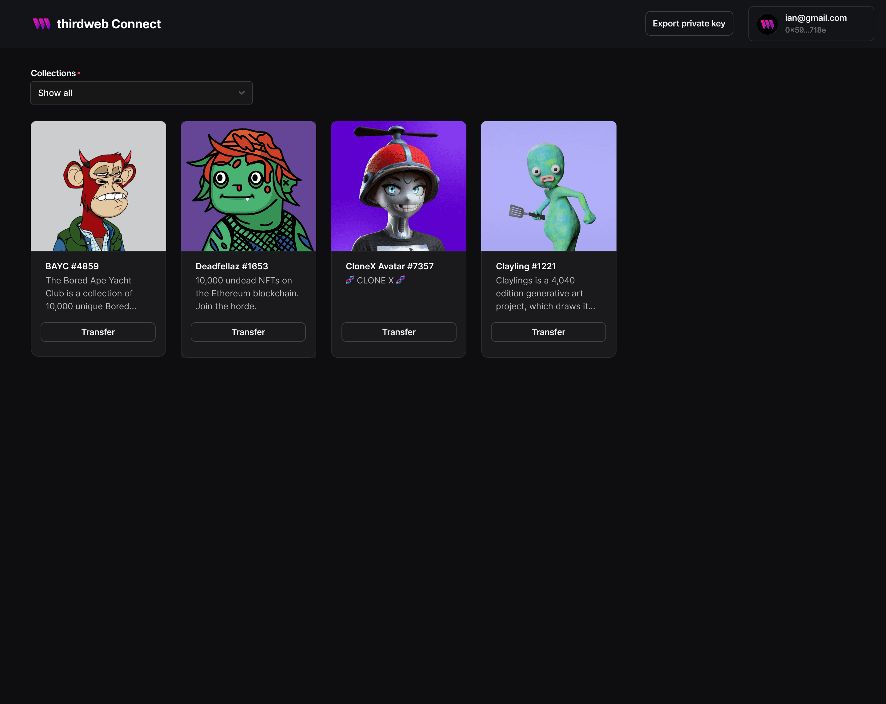 Every Ecosystem Wallet deployment will also create a wallet management page that you can share with your partners and users. End users can visit this page to view tokens and assets in the in-app wallets they’ve created across your ecosystem.