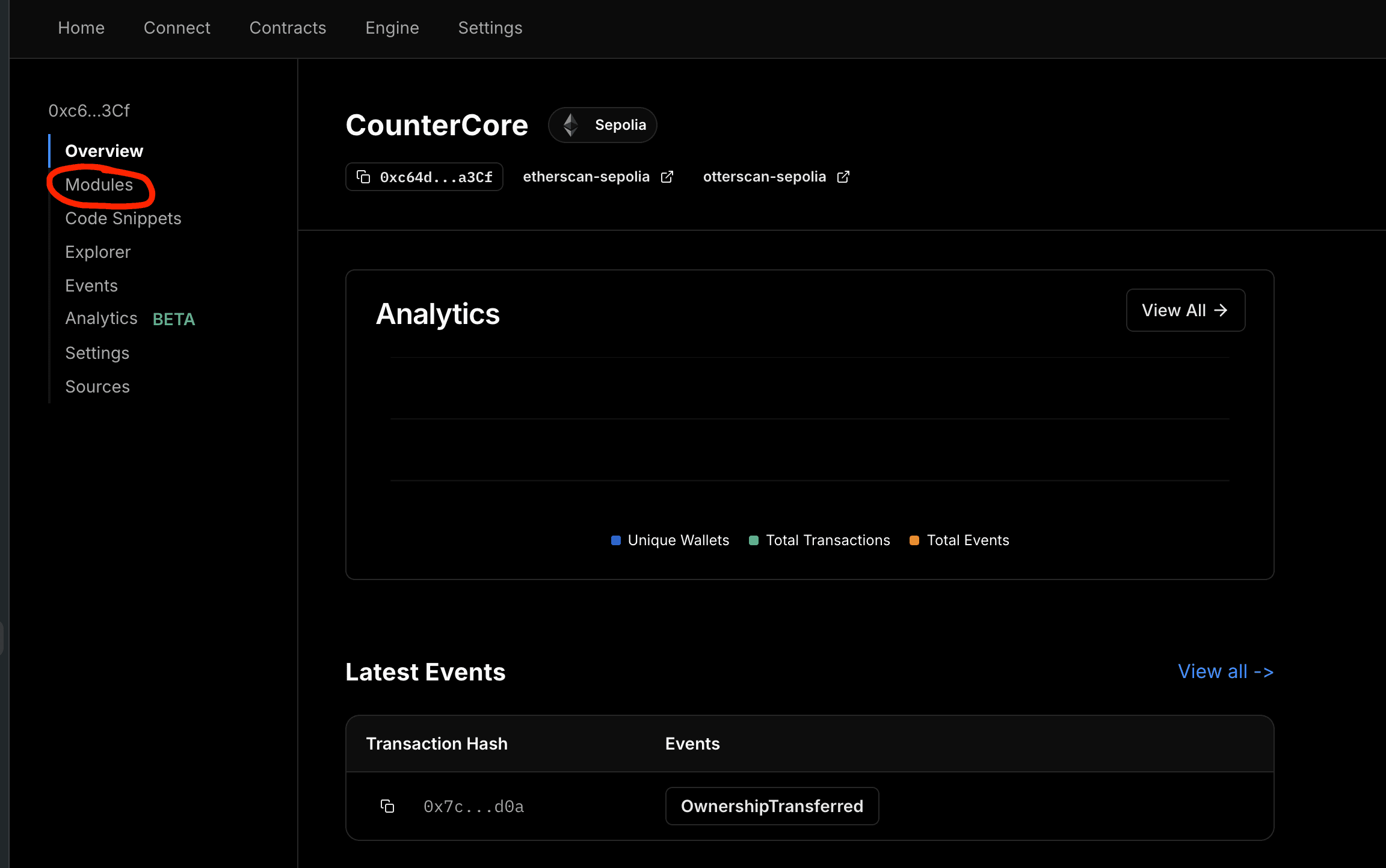 On the contract dashboard, click on "Modules" in the left-hand sidebar.