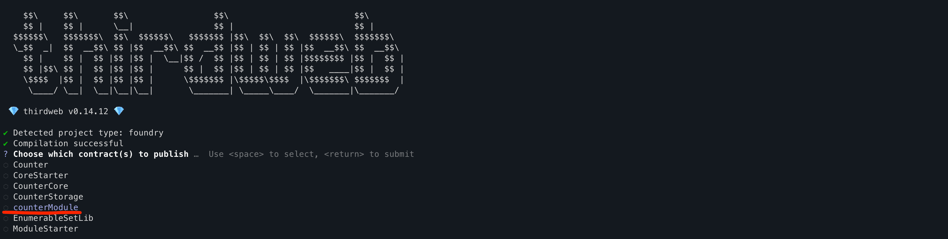 This guide will show you how to publish a Modular Contract that increments a counter. If you're interested in learning how modular contracts work, refer to How it works. If you haven't read through Create a Core Contract and Create a Module Contract, please do so before proceeding as this guide will build on top of those previous guides.